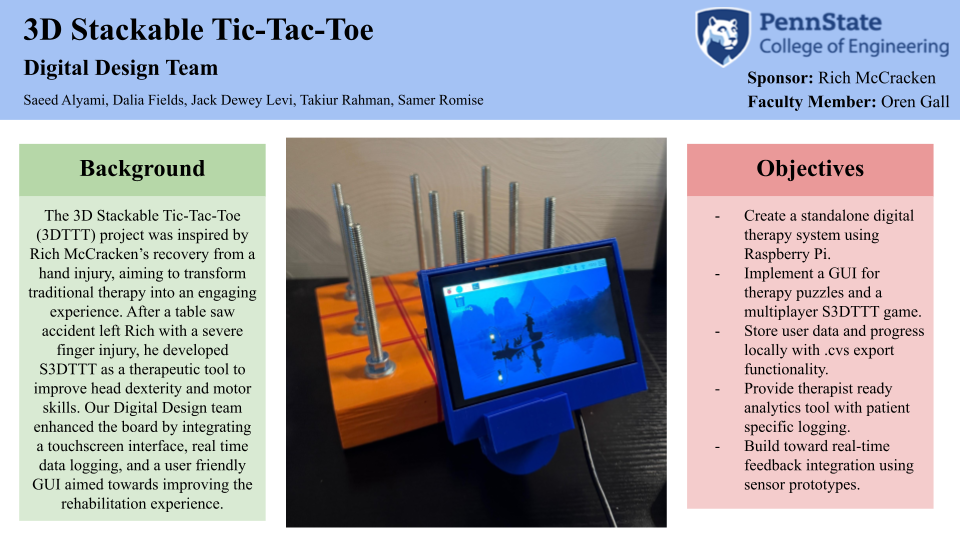 I co-led a team of five, splitting work across hardware and software. On the hardware side, I designed the 3D parts in SolidWorks, then made machining edits for a small, durable case that holds the Raspberry Pi and screen, and attaches to the physical board, allowing for any level of adjustment. On the programming side, I assisted with building a Python+SQL application and database that allows the application to have accounts/login, profile management, puzzle selection and timing, S3DTTT gameplay logging, and local CSV export for easy analysis. Everything was also structured for future expansion to richer analytics and deeper sensor integration.